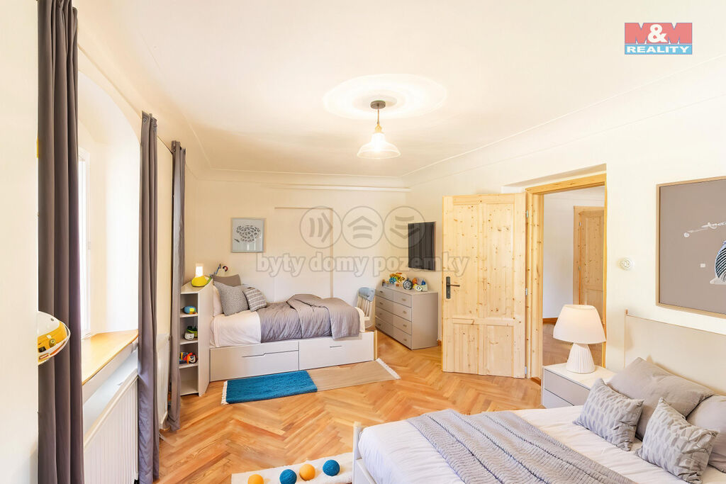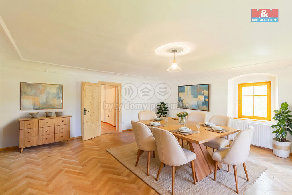 Dům má 8 pokojů, 3 koupelny, 2 sklepy a půdu s dalším potenciálem.