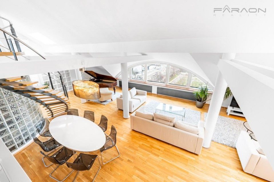 K pronájmu luxusní dvoupatrový byt 5+kk, 250 m2 s terasou a zimní zahradou, s nádherným výhledem na řeku Vltavu, Pražský Hrad a Petřín, v 6. a 7. patře kompletně zrekonstruované historické secesní budovy s výtahem v blízkosti nábřeží, pár minut od Palackého náměstí a Karlova náměstí, v ulici Dřevná, Nové Město, Praha 2.
