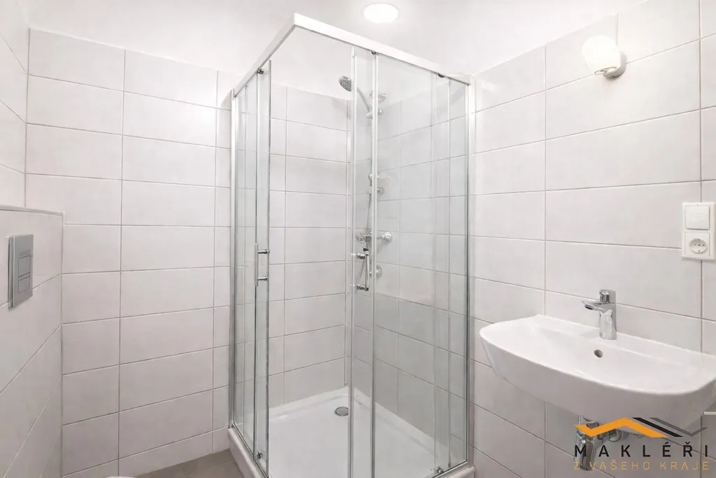 Koupelna je vybavena sprchovým koutem, umyvadlem a toaletou. Byt působí vzdušně a je vhodný pro jednotlivce nebo pár.