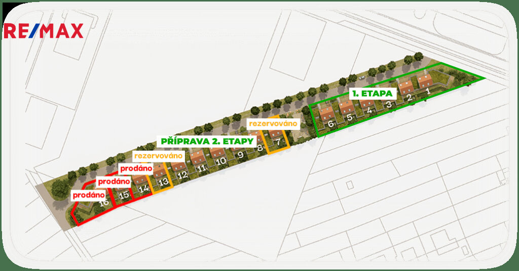 Nových 16 stavebních pozemků nabízí různé celkové výměry od 260 m² do 554 m² a všechny shodně nabízejí zastavěnou plochu rodinného domu 128 m².