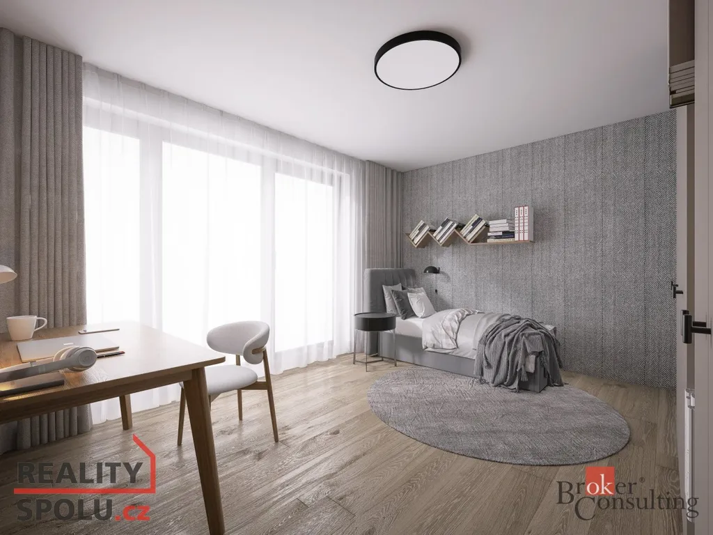 Součástí apartmánu je komfortní samostatná ložnice, která poskytuje dostatek místa pro manželskou postel, úložné prostory a klidné zázemí pro odpočinek. Dominantou je rozlehlý obývací pokoj s kuchyňským koutem, prosvětlený velkoformátovými prosklenými okny. Ty propojují interiér s exteriérem a poskytují výhled na parkoviště a okolní zázemí.