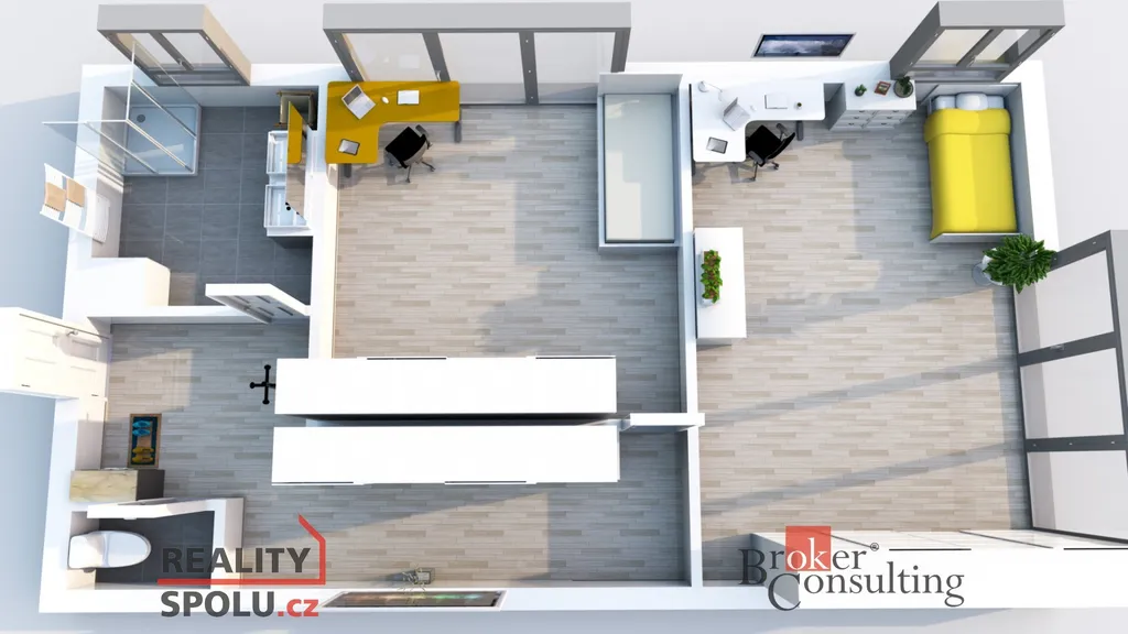 Obývací část nabízí prostor pro pohodlnou sedací soupravu, jídelní kout i kuchyňskou linku dle vlastních představ. Koupelna je navržena v kompletním standardu – se sprchovým koutem, umyvadlem a toaletou.