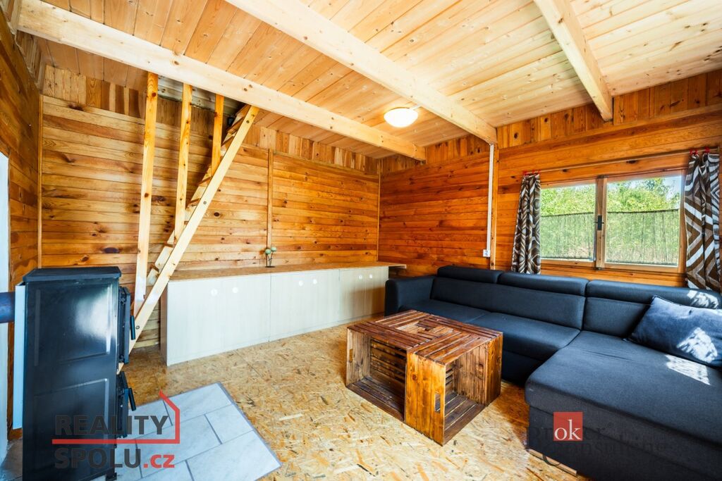 Hlavní obytná místnost s možností vstupu do patra, které slouží jako přespávací prostor (podkroví s nižší výškou stropu pod skosenou střechou).