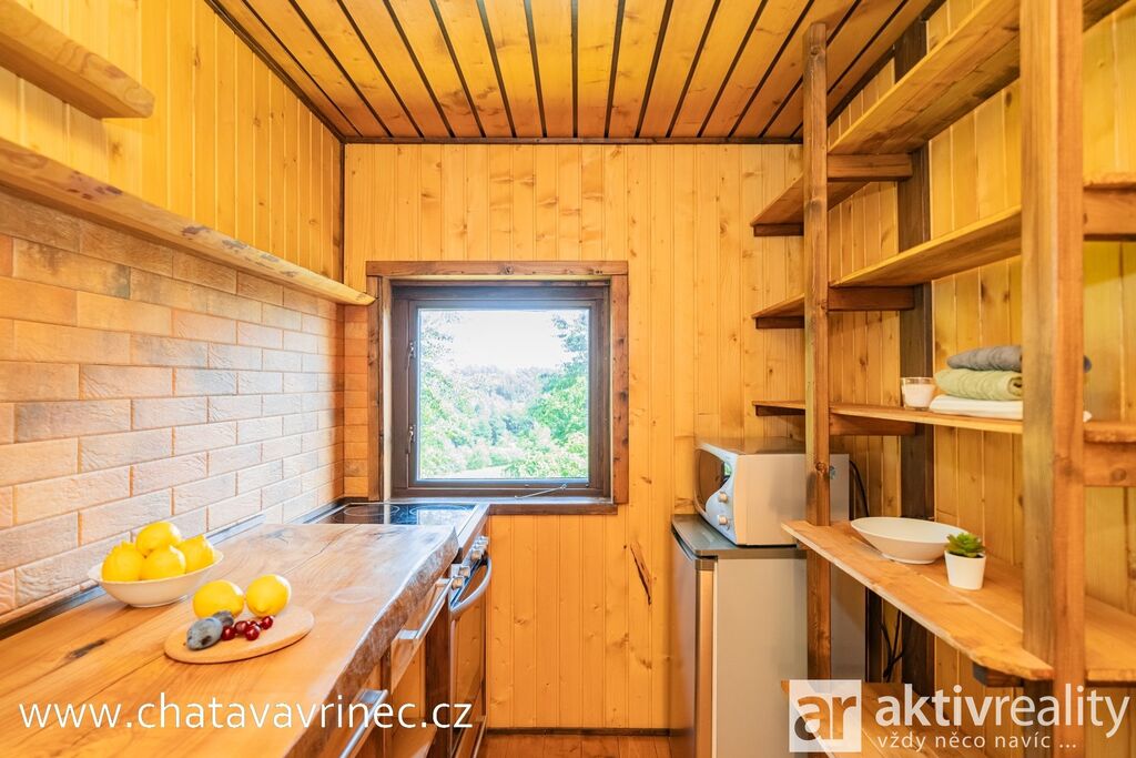 Přízemí (24 m2): plně vybavená kuchyně s masivní jasanovou deskou, obývací pokoj s krbovými kamny, samostatné WC.