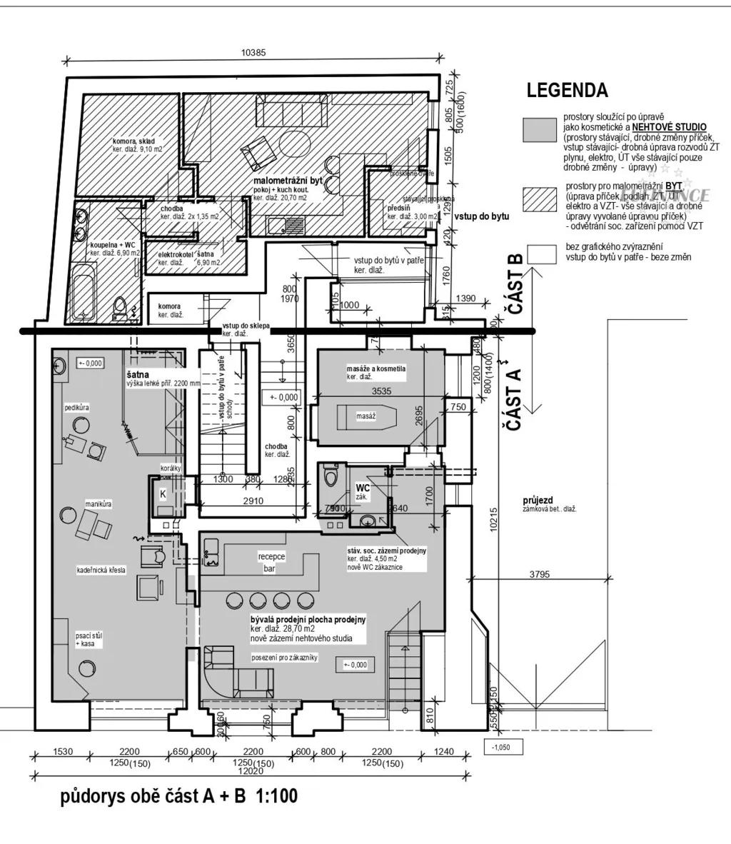 Celá nemovitost má platné Prohlášení vlastníka a je řádně zkolaudována, na vyžádání pošleme emailem. Na prodejnu je dále Stavebním úřadem schválena změna užívání na kosmetické a nehtové studio, nicméně nadále může zůstat stávající využití prodejny.