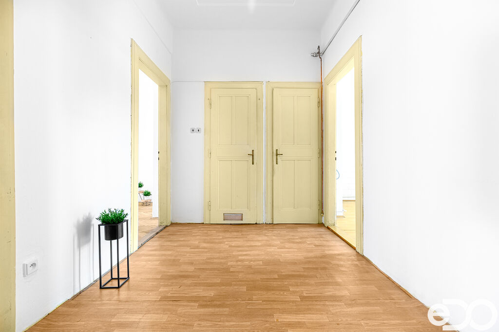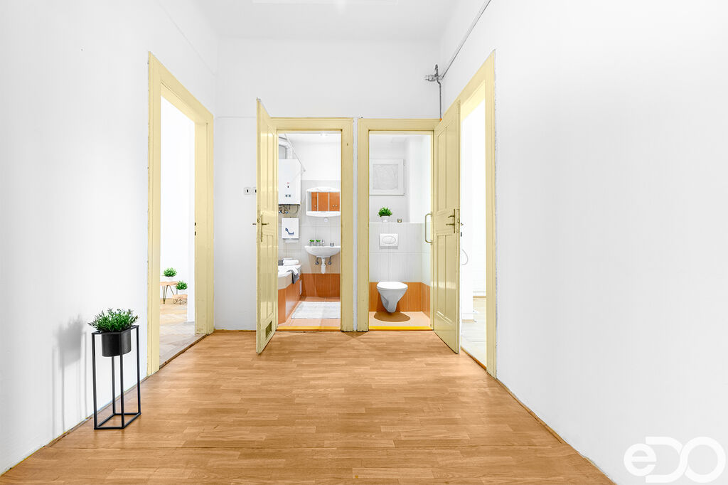 Dispozice bytu (obytná plocha 84,5 m2) zahrnuje vstupní předsíň, velkou chodbu, tři prostorné pokoje (z toho jeden s kuchyňským koutem), komoru, koupelnu s vanou a samostatnou toaletu. Dva pokoje jsou orientovány do tiché jednosměrné ulice, třetí pokoj s kuchyňským koutem pak do vnitrobloku. Celou nemovitost si můžete projít v klidu domova prostřednictvím virtuální prohlídky, která je součástí prezentace. Součástí bytu je také zděný sklep o výměře 4 m2.