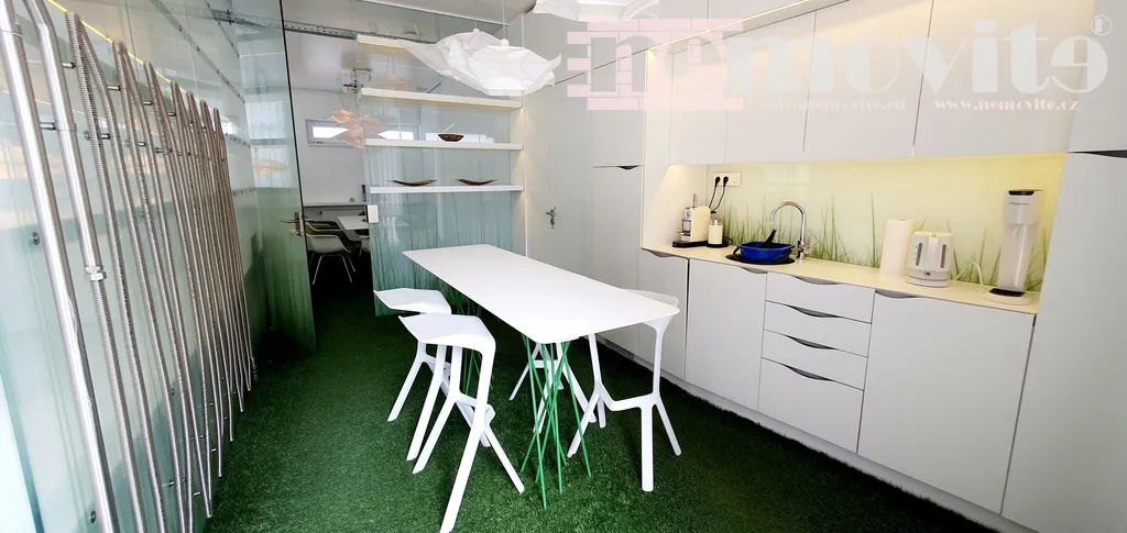 Exkluzivně nabízíme na prodej kompletně vybavenou luxusní kancelář - Jesenice, Praha západ, včetně jednoho parkovacího místa v garážích pod domem, možnost okamžitého používání. Přízemní elektronicky zabezpečená bezbariérová kancelář je vybavena kuchyňkou, jídelním stolem se židlemi, konferenčním stolem se židlemi, jedno oddělené manažerské místo a dvě místa pro pracovníky, 2x klimatizace, myčka, datový projektor s plátnem, lednice, mikrovlnka, toaleta, cena je včetně kompletního vybavení. Bezproblémové parkování u domu v ulici. Vážným zájemcům doporučujeme prohlídku.