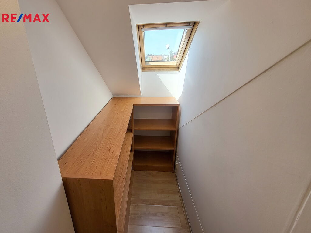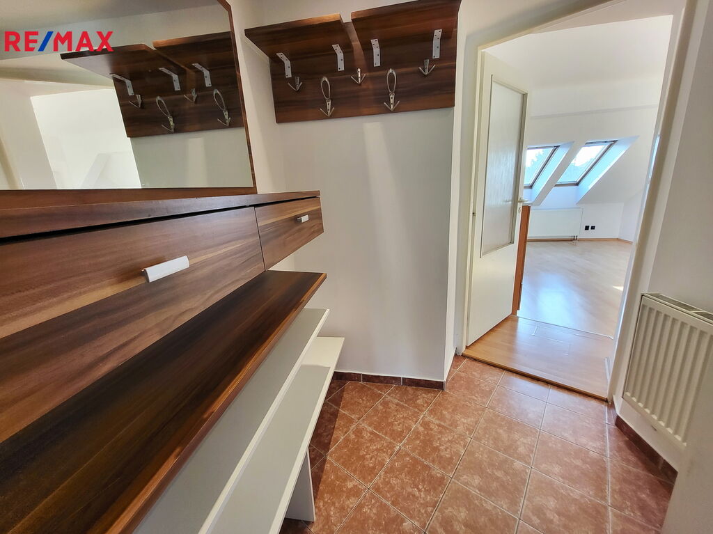 Vstupní chodba do bytu s extra úložným prostorem v podhledu vede do obývací místnosti s kuchyňským koutem. Kychyňský kout stojící na vyvýšeném pódiu je vybavený vestavnou troubou, plynovým sporákem, digestoří a myčkou značky Whirpool. Ostrůvek slouží nejen jako další pracovní plocha, ale je také vybaven oboustranným úložným prostorem se šuplíky. V rohu vedle linky je navíc praktická komora-špajz. Posezení u okna nabízí další úložné prostory. Z obývacího pokoje se dostaneme do ložnice s vestavnou skříní. Na ložnici navazuje koupelna s vanou, místem pro pračku a plynovým kotlem zn. Protherm. Okna v celém bytě směřují na západ.