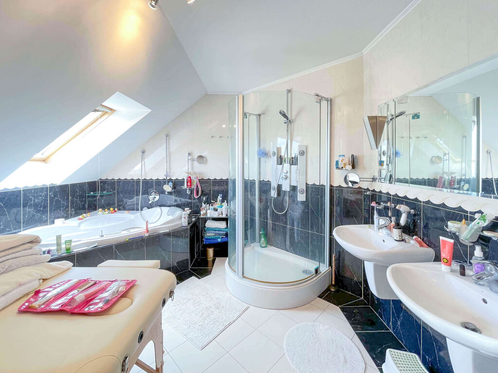 • 1. patro: 4 ložnice (část s balkonem), prostorná koupelna: masážní vana, sprchový kout HÜPPE, sauna, WC a bidet; fitness/úložná zóna. Dvě jiho-orientované ložnice mají klimatizaci s možností přitápění.
