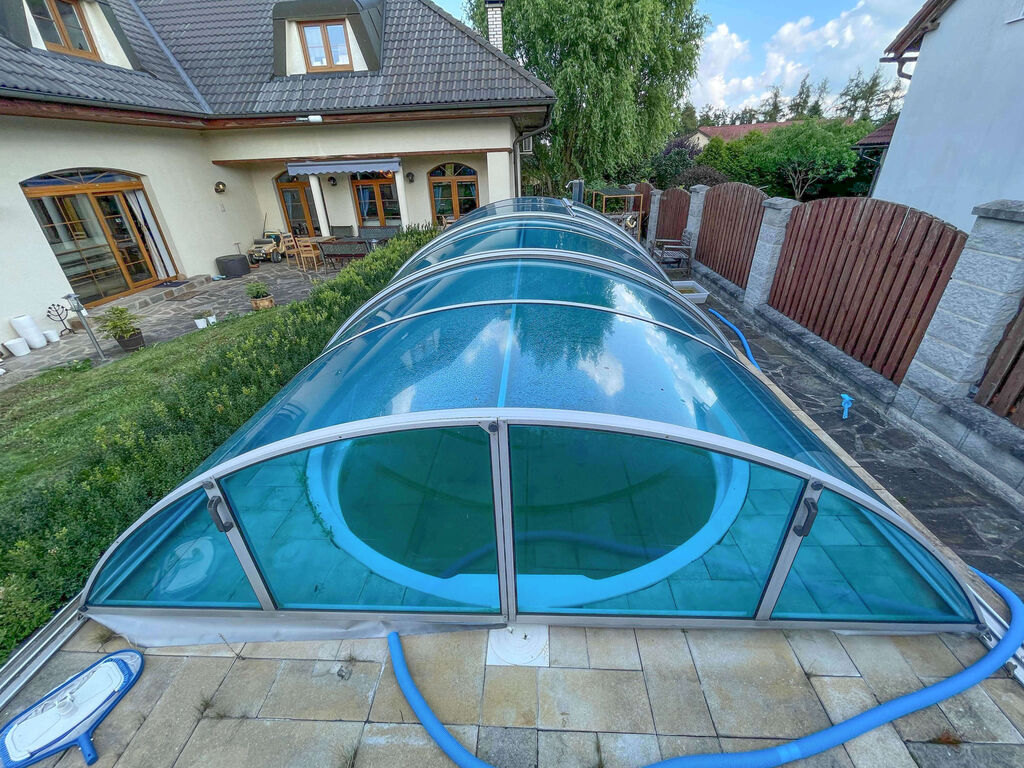 • zastřešená pergola se zahradním krbem, krytý bazén (vyhřívání + protiproud)