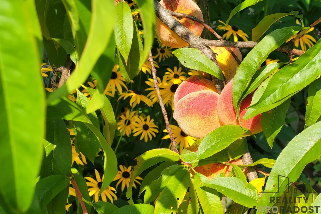 Pozemek je pečlivě udržovaný a pyšní se vzrostlými ovocnými stromy – jabloní, broskví, švestkou, kdouloňí či netradičním kiwi. Nechybí ani bobuloviny: maliny, ostružiny, borůvky, černý a červený rybíz, rakytník, černý jeřáb či dřín.