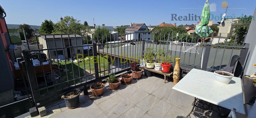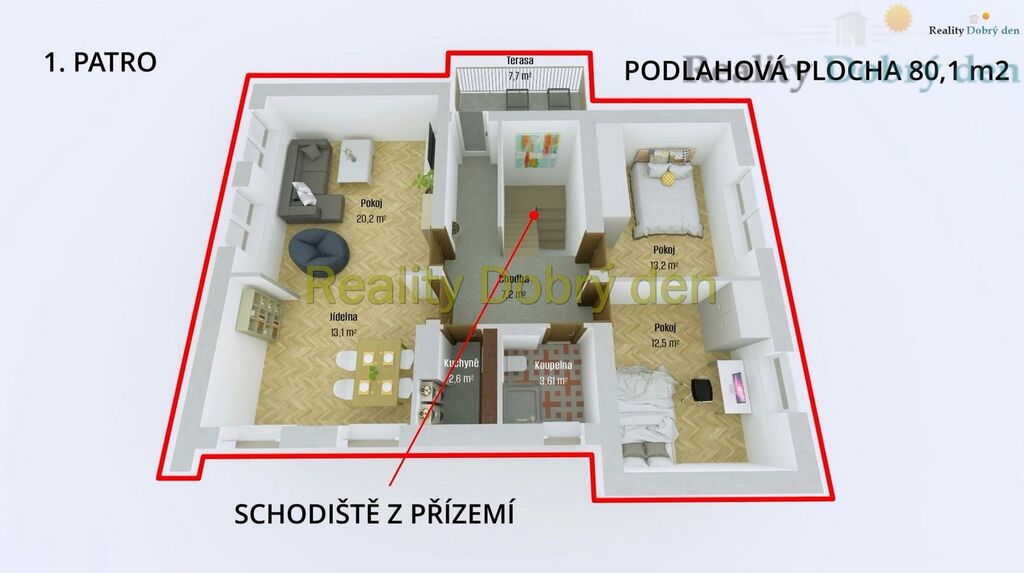 V prvním patře jsou 4 pokoje, kuchyně, koupelna se sprchovým koutem a WC, výstup na terasu. Horní byt má rovněž samostatný vchod přes terasu, což umožňuje rozdělit dům na dvě zcela oddělené samostatné bytové jednotky.