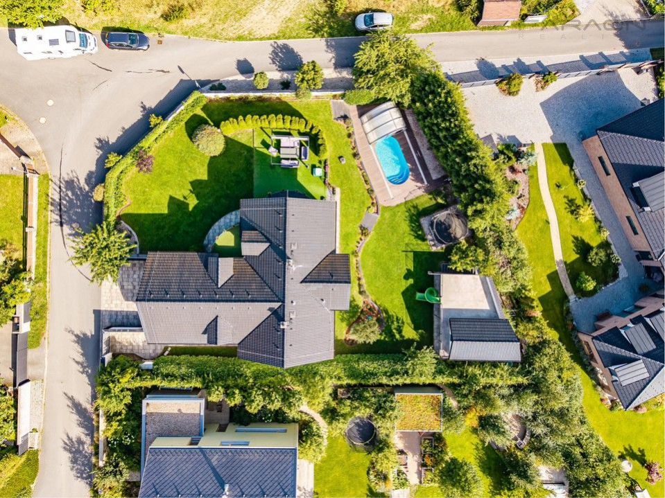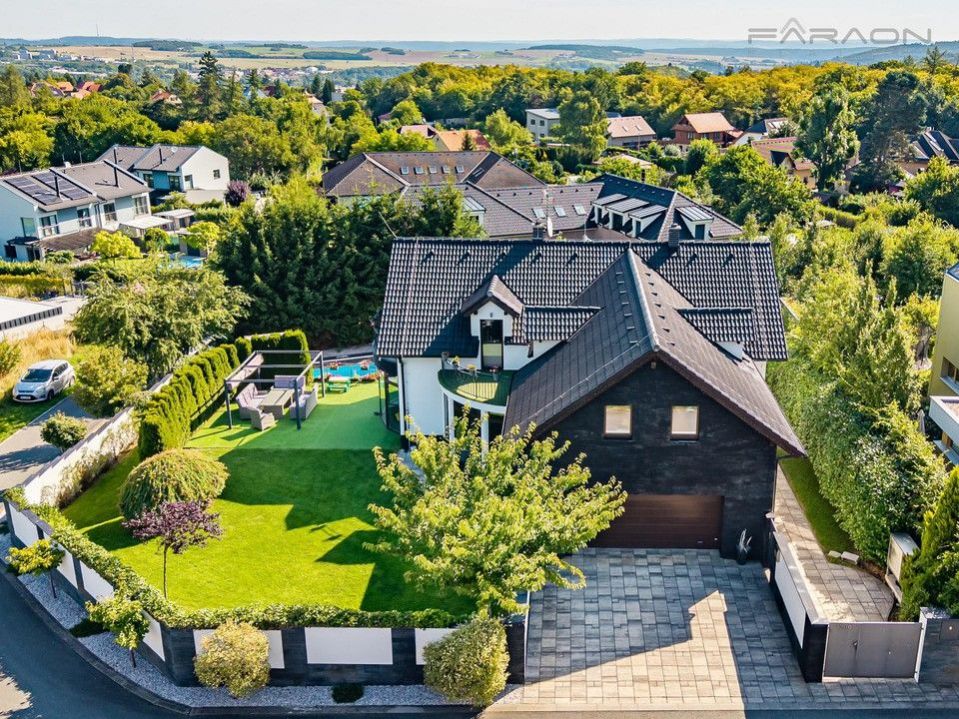 Dům zahrnuje dvě podlaží a půdní prostor s celkovým počtem 7 pokojů s kuchyní plus pracovnu. K dispozici jsou prostorné terasy a balkón, které nabízí příjemné venkovní posezení s výhledem. Nemovitost disponuje garáží a dalšími parkovacími místy na pozemku.
