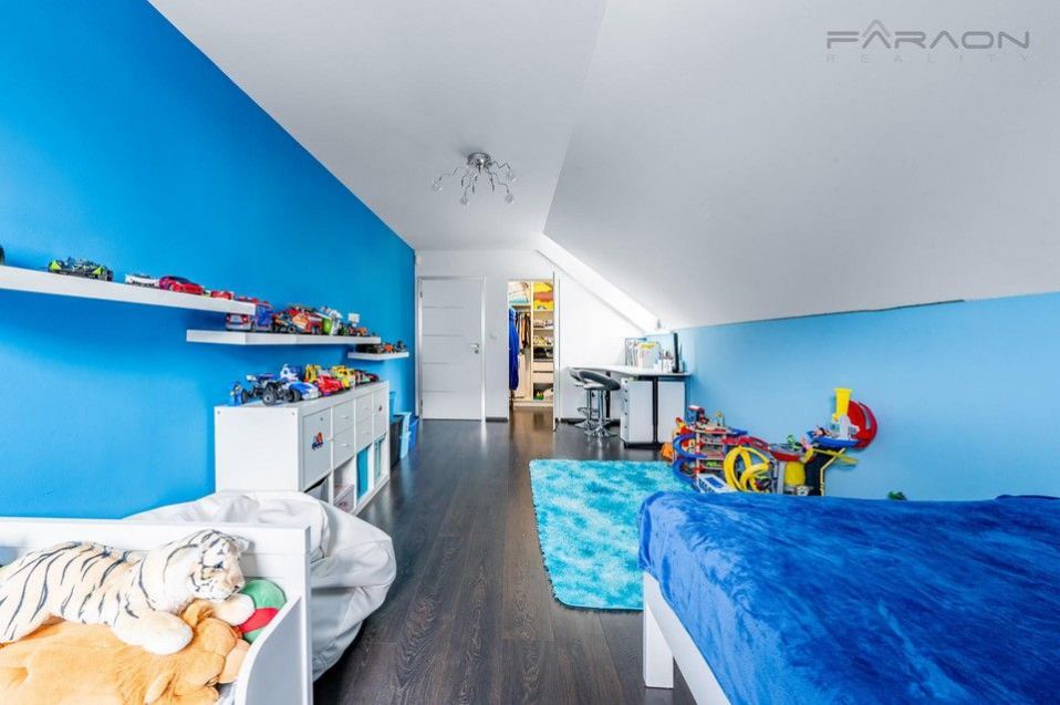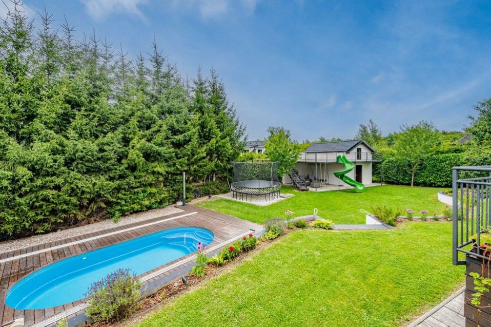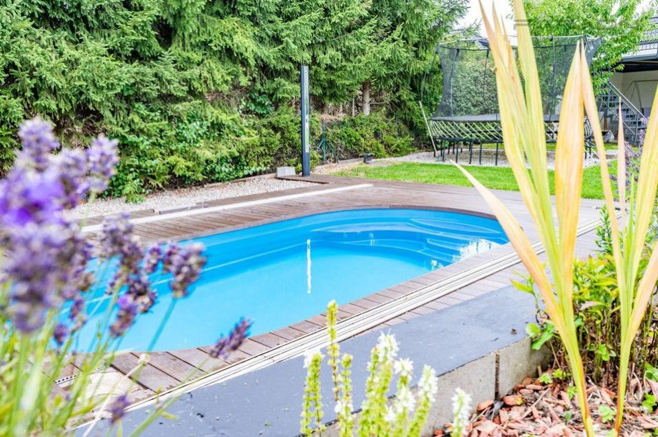 Součástí pozemku je vyhřívaný bazén o rozměrech 6x3 metry a samostatný letní domek pro děti, který lze využít i jako letní kuchyň nebo domek pro hosty.