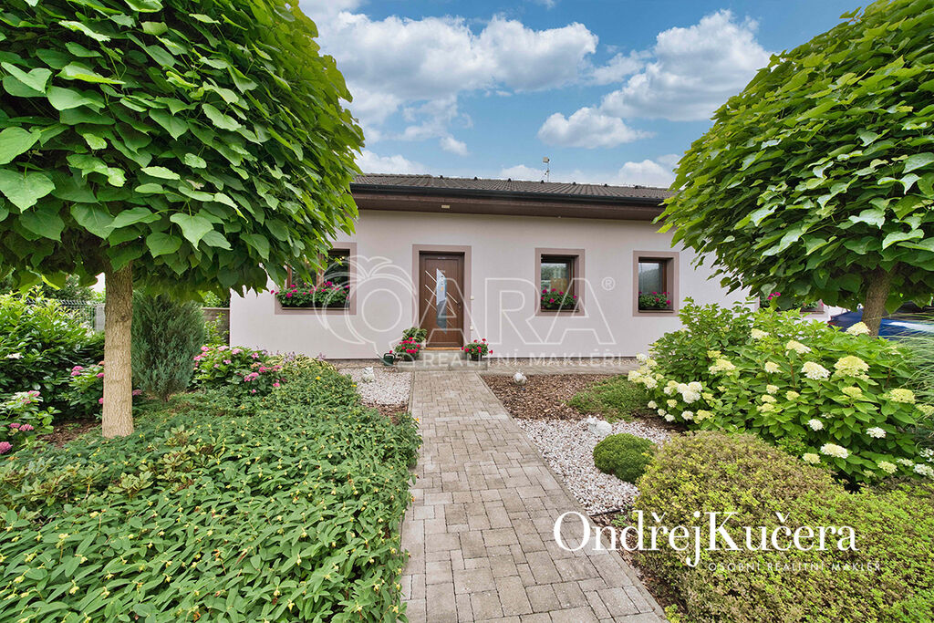 Zahrada kolem domu byla promyšleně navržena architektem, aby se během roku měnila v pestrou podívanou. Automatický zavlažovací systém napojený na vlastní vrt a retenční nádrž zajišťuje její nenáročnou údržbu. Je zde také zapuštěný keramický bazén se slanou vodou a samostatný zahradní domek s dílnou. Součástí prodeje je i automatická sekačka.