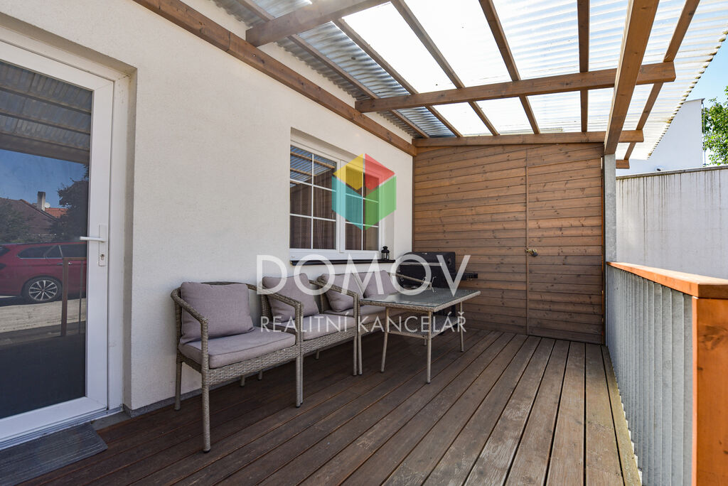 Za domem vás potěší terasa se zastřešenou pergolou a zahradním domkem, ideální pro letní posezení.