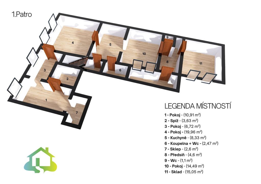 V přízemí se nachází vstupní chodba, kancelář, technická místnost a prostorná garáž (bývalý obchod). V 1.patře jsou dva apartmány o velikosti 1+1 a 2+kk, každý má svůj vlastní vchod. Ve 2.patře je apartmán o velikosti 2+1 a také mezonetový apartmán 3+kk (celkem 4 obytné jednotky).