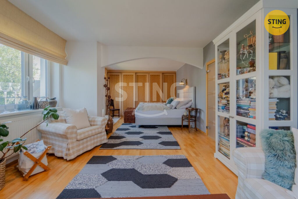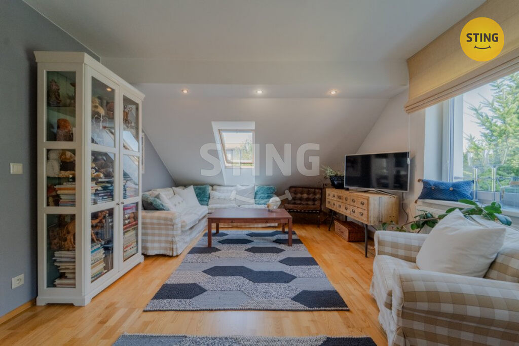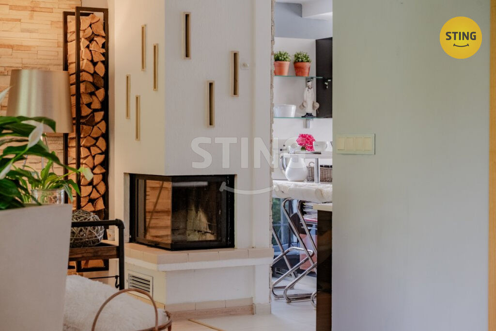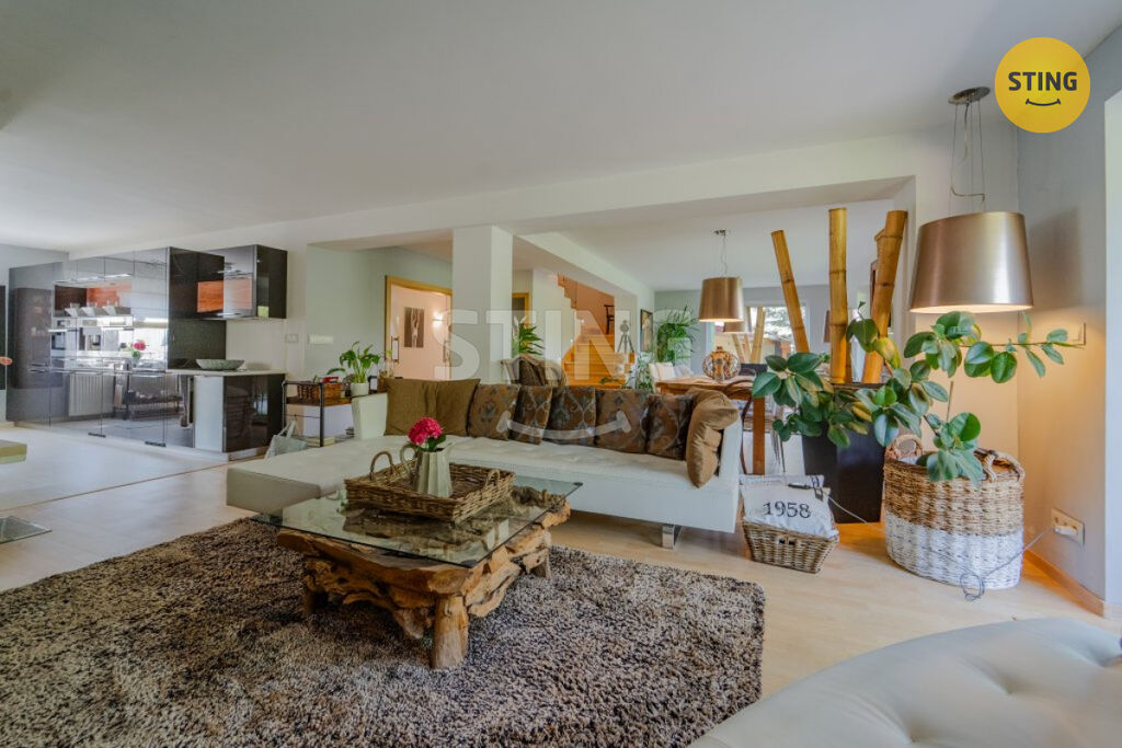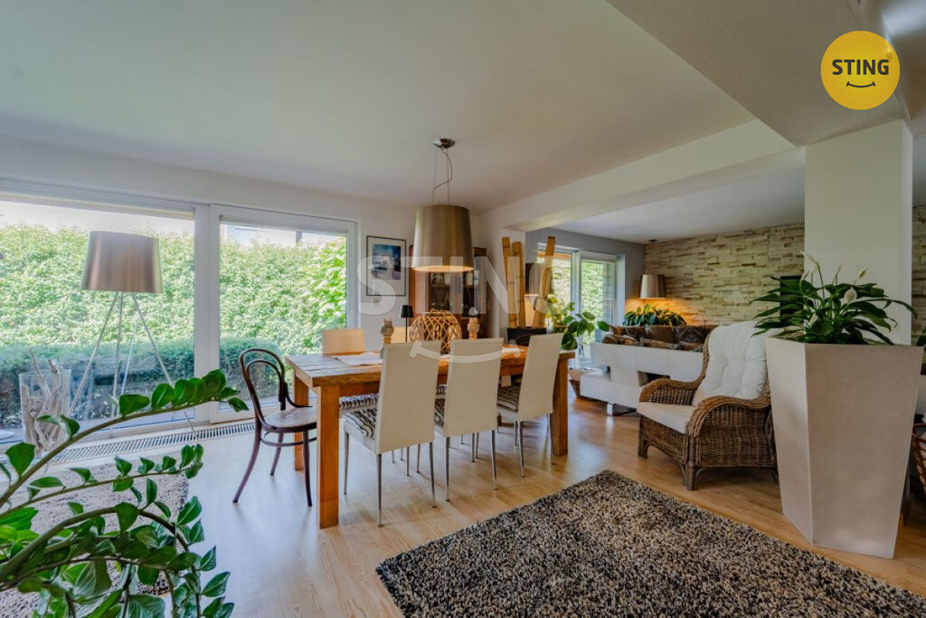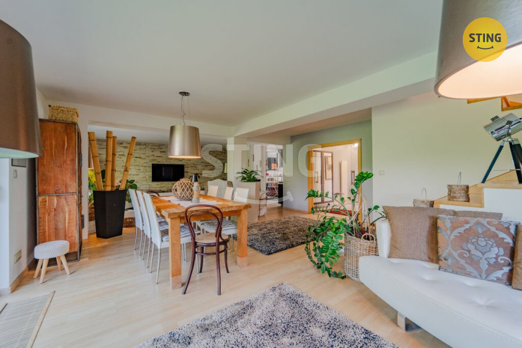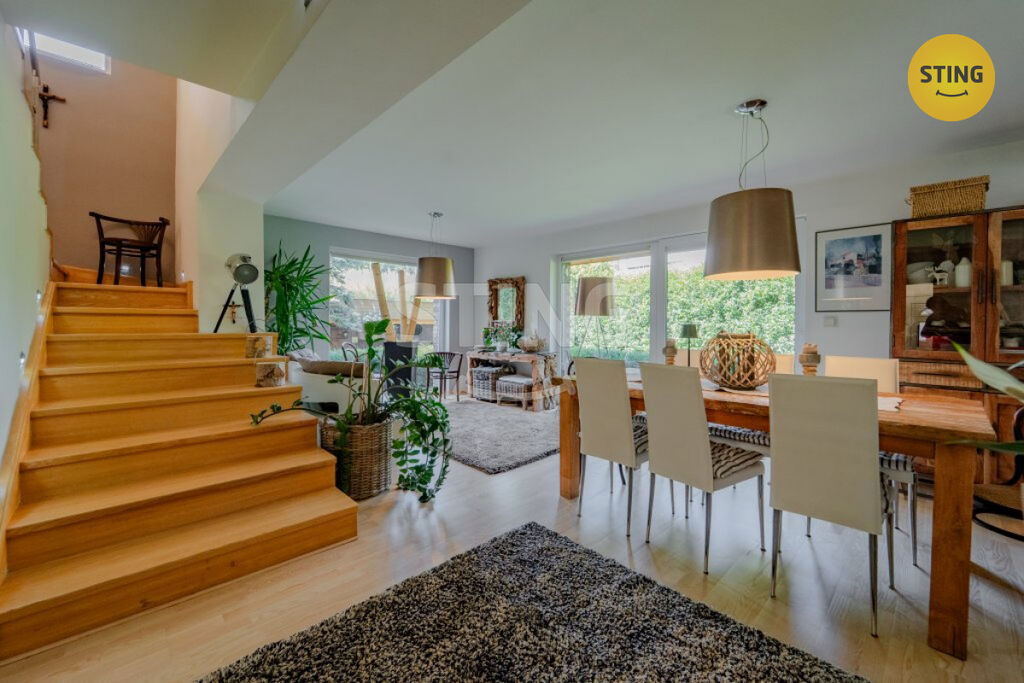 Spodní patro domu tvoří velký, vzdušný a propojený prostor zahrnující obývací pokoj s krbem, jídelnu a kuchyni vybavenou spotřebiči Miele, včetně vestavěného kávovaru. Z tohoto reprezentativního prostoru je přímý vstup na zahradu s venkovním posezením, ideálním pro rodinná setkání či relaxaci.