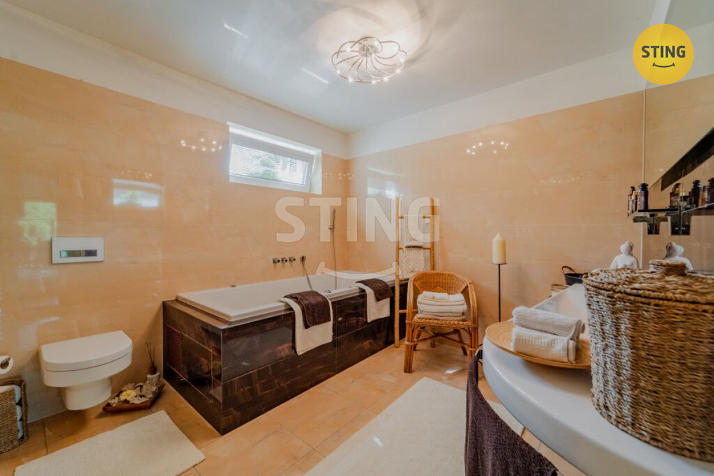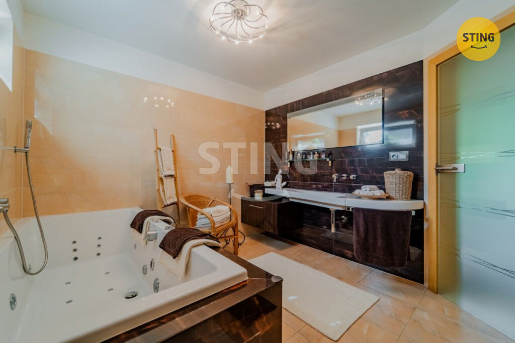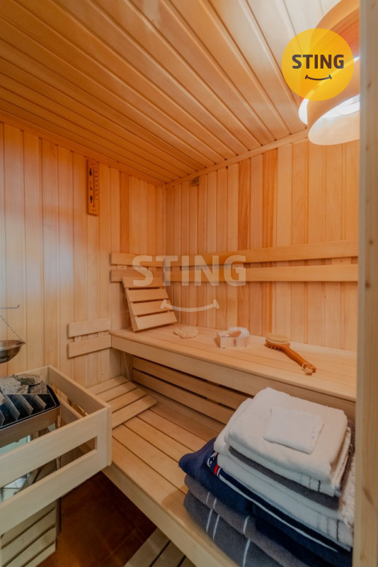 V domě jsou tedy dvě koupelny – první s relaxační saunou, druhá s masážní vanou a světelnou terapií, které poskytují jedinečný prostor pro odpočinek a regeneraci.