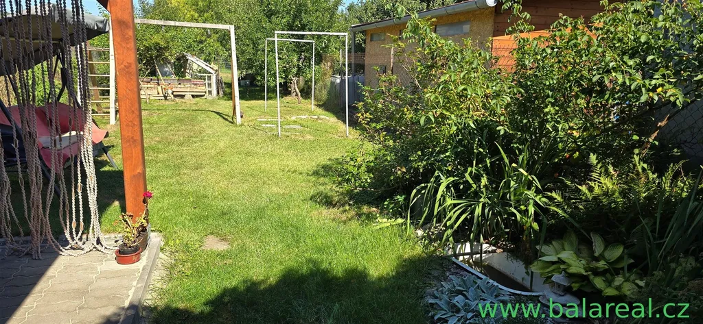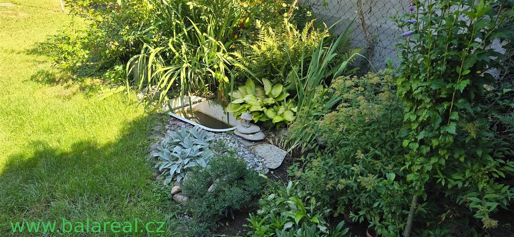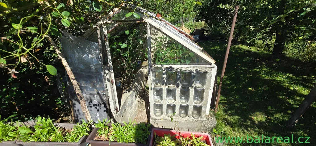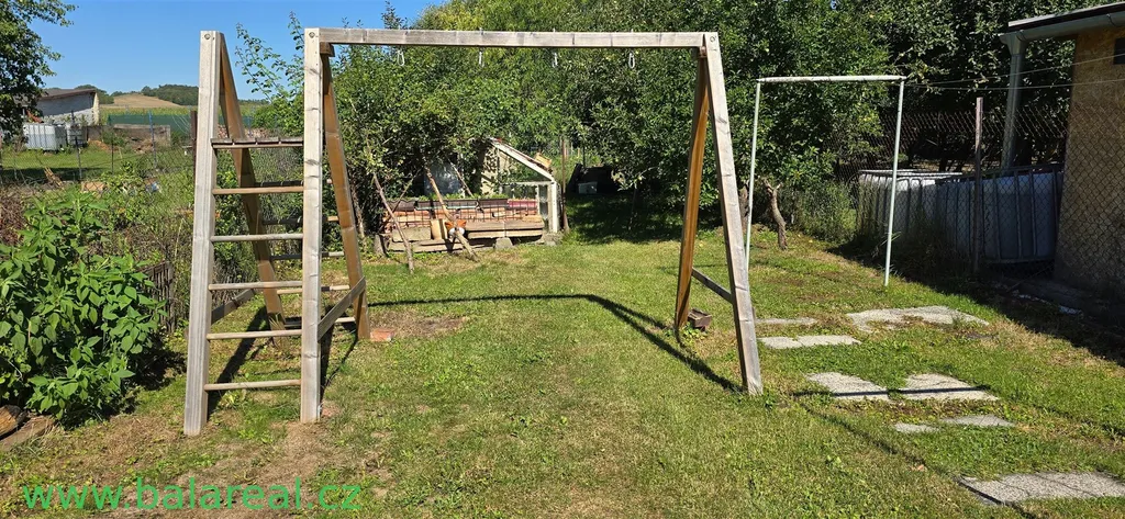 udržovanou oplocenou zahradu s ovocnými stromy , vlastní studnu s užitkovou vodou, dřevěnou pergolu vhodnou k posezení ,skleník.
