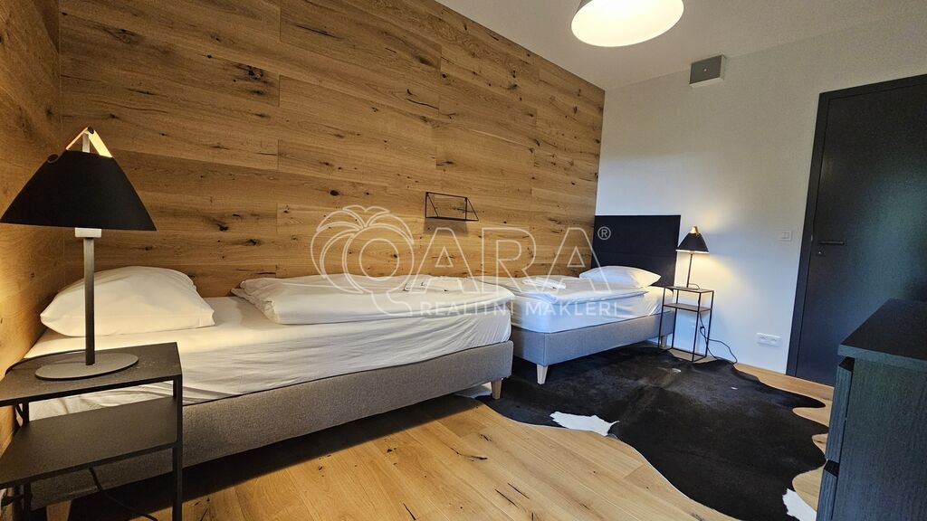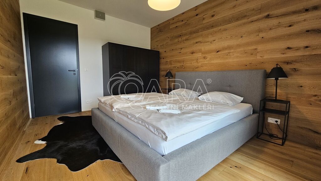 Překvapí vás moderním vybavením i příjemně sladěnými interiéry. Je navržen tak, aby co nejlépe vyhovoval potřebám rodin. V prostorném obývacím pokoji můžete snadno vytvořit hernu, kde si vaše děti mohou hrát a rozvíjet své tvořivé schopnosti. Je zde také dostatek prostoru pro rodinné aktivity, společné hry a pro chvíle relaxace. Velká francouzská okna spojující apartmán s rozlehlou terasou vám zajistí jedinečné spojení s přírodou.