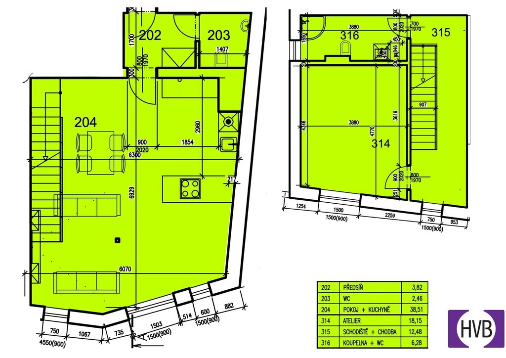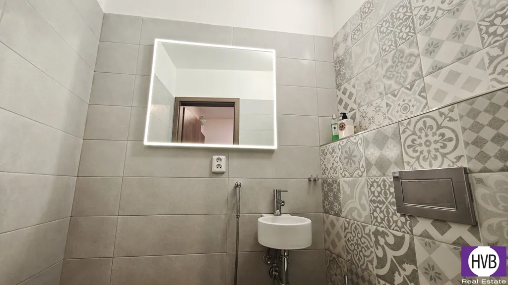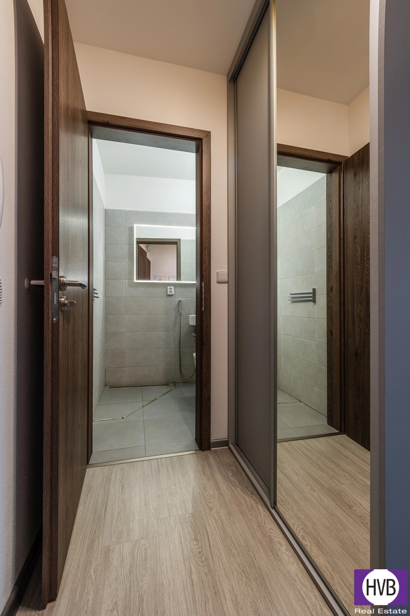 Dispozice bytu nabízí v nižším podlaží chodbu, první z koupelen a prostorný obývací pokoj s plně vybaveným, moderním kuchyňským koutem. Z obývacího pokoje vedou designové schody do druhého patra bytu, kde se nachází chodba s prostorem pro vytvoření pracovního nebo cvičebního koutu, ložnice s velkou vestavěnou skříní se zrcadlem a druhá koupelna se sprchovým koutem, WC, pračkou, sušičkou a plynovým kondenzačním kotlem.