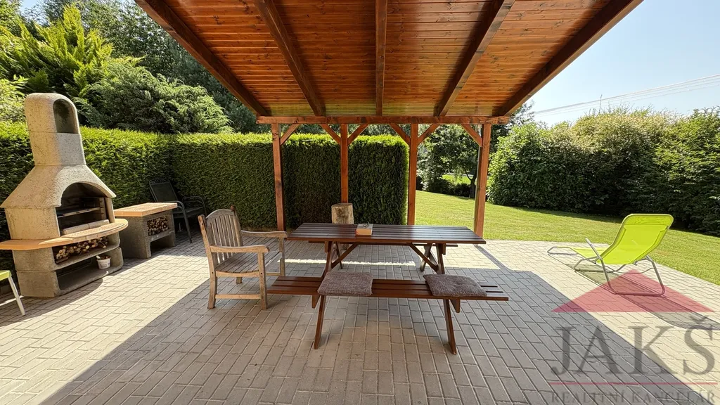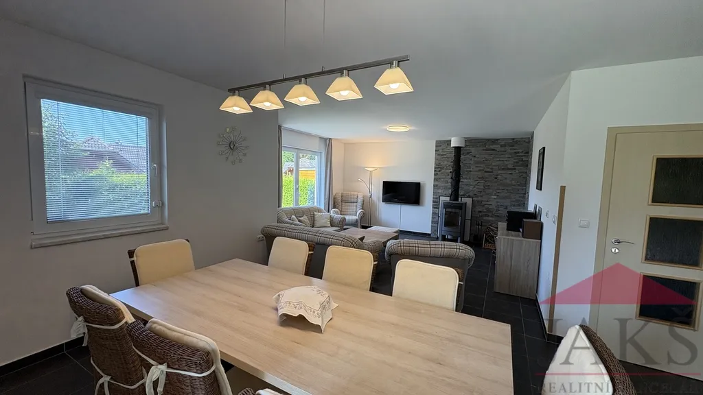 Popis: technická část: garáž (regály) a technická místnost (pračka); 1.NP (81,54 m2): předsíň (věšáky s botníkem), koupelna s finskou saunou (sprch. kout, umyv. se zrcadlem), sam. WC s umyv., ložnice, hala se schodištěm, komora (2x el. boiler), prostorný obývací pokoj 49 m2 s kuchyňským koutem (rohová kuch. linka s vestav. spotřebiči: HV a MV trouba, sklo-ker. deska, lednice, digestoř a myčka), jídelnou, krbovými kamny a vstupem na zastřešenou terasu s posezením a venkovním krbem; 2.NP (80,12 m2): podesta, koupelna (vana, sprch. kout, umyv. se zrcadlem, WC, topný žebřík), ložnice, 2x ložnice s balkonem s dechberoucím výhledem, uzamykatelná hlavní ložnice s vlastní koupelnou (vana, sprch. kout, umyv. se zrcadlem, WC, topný žebřík) s balkonem, šatnou a předsíní (vest. skříň). Movité vybavení vč. nábytku je v ceně.