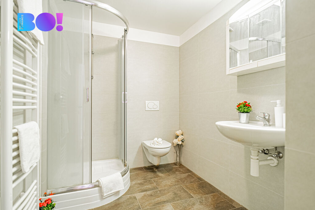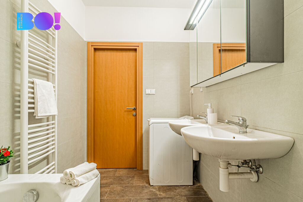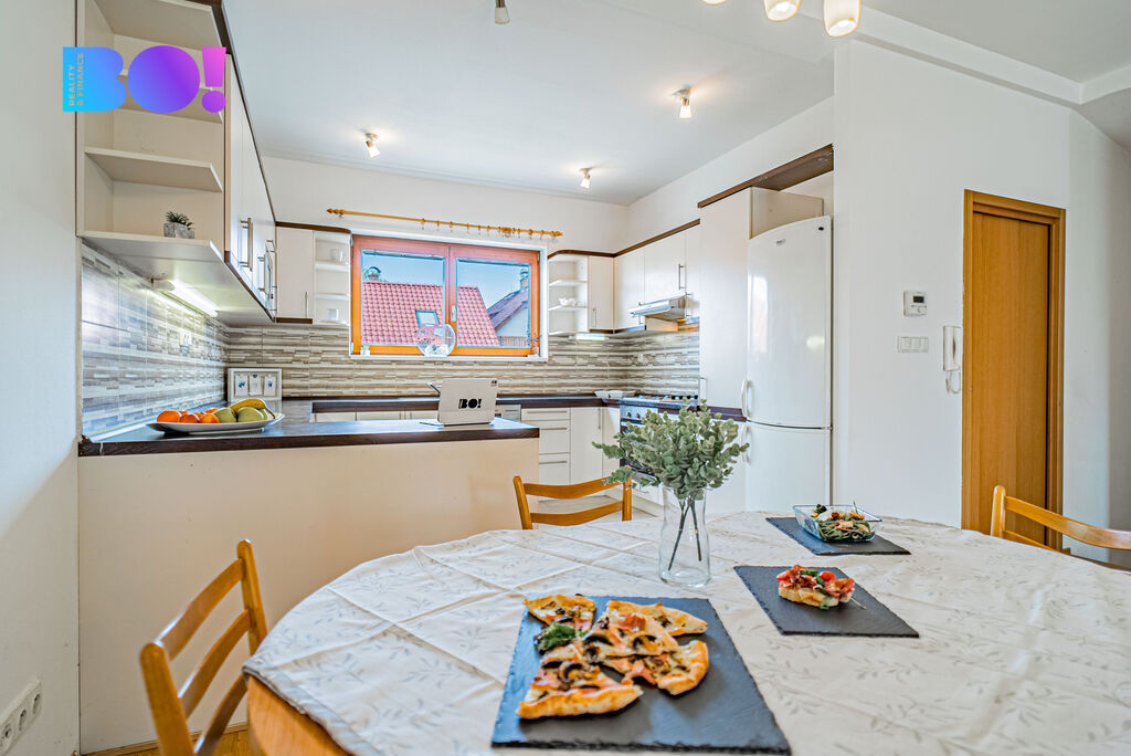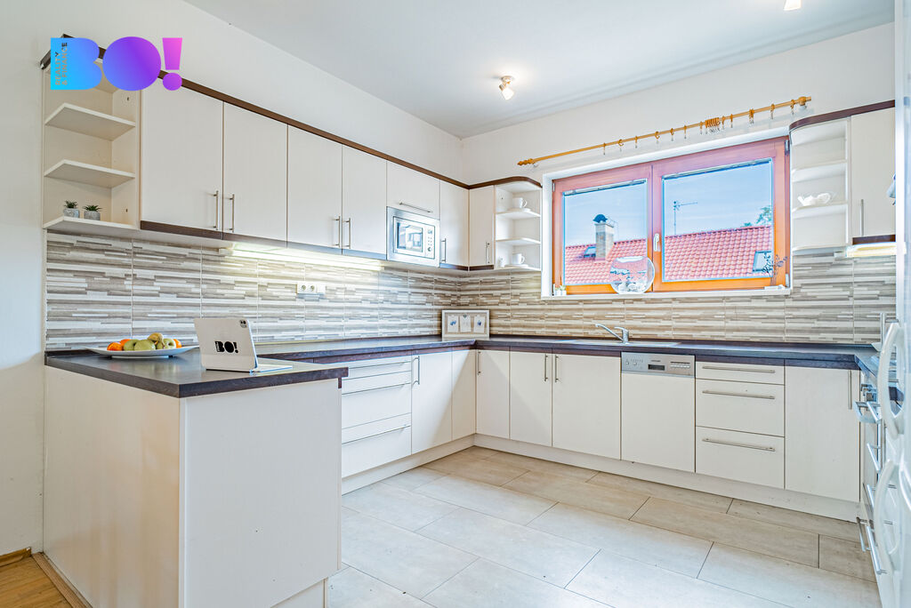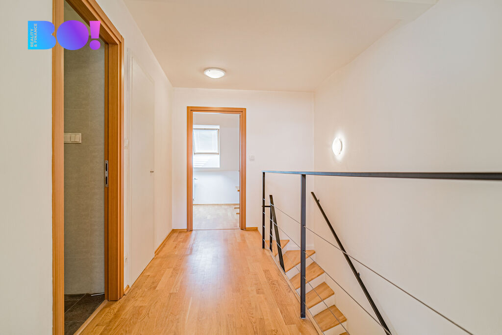 Kuchyň propojená s obývacím pokojem nabízí 55 m² nadčasového prostoru s velkým množstvím denního světla – vysoké stropy a velká okna vytváří vzdušný dojem, který nebývá v řadových domech obvyklý. V celém domě naleznete kvalitní dřevěné masivní podlahy, dveře a zárubně i dřevěná střešní okna Velux a nadčasový design. V domě jsou dvě koupelny a každé patro má min. 1 WC, což je komfortní i pro větší rodinu nebo zástupce více generací. Všechna okna jsou opatřena žaluziemi.