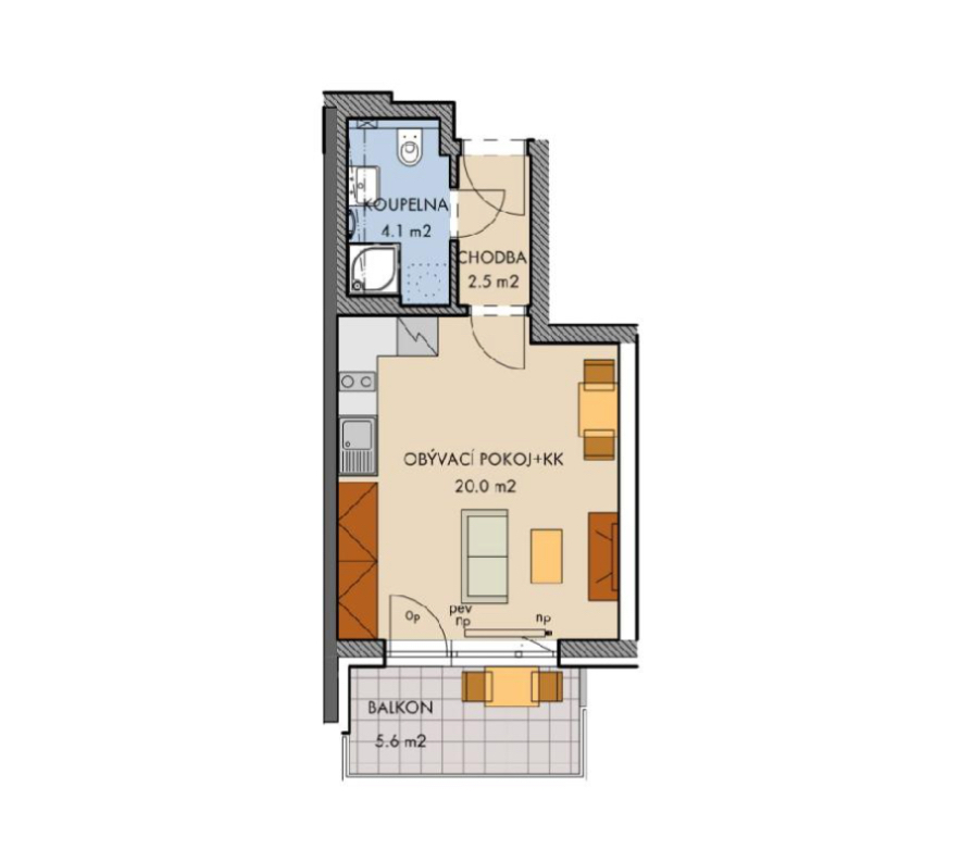 Vnitřní dispozice: Vstupní chodba kde se nachází vstup do obývacího pokoje spojeného s kuchyňským koutem, který nabízí přímí vstup na balkón, kuchyňský kout vybaven vestavnými spotřebiči. Dále z chodby je vstup do koupelny s sprchovým koutem a toaletou.