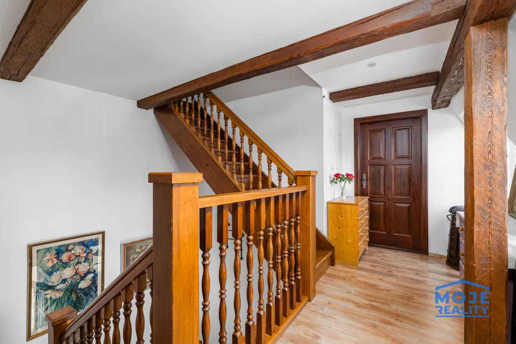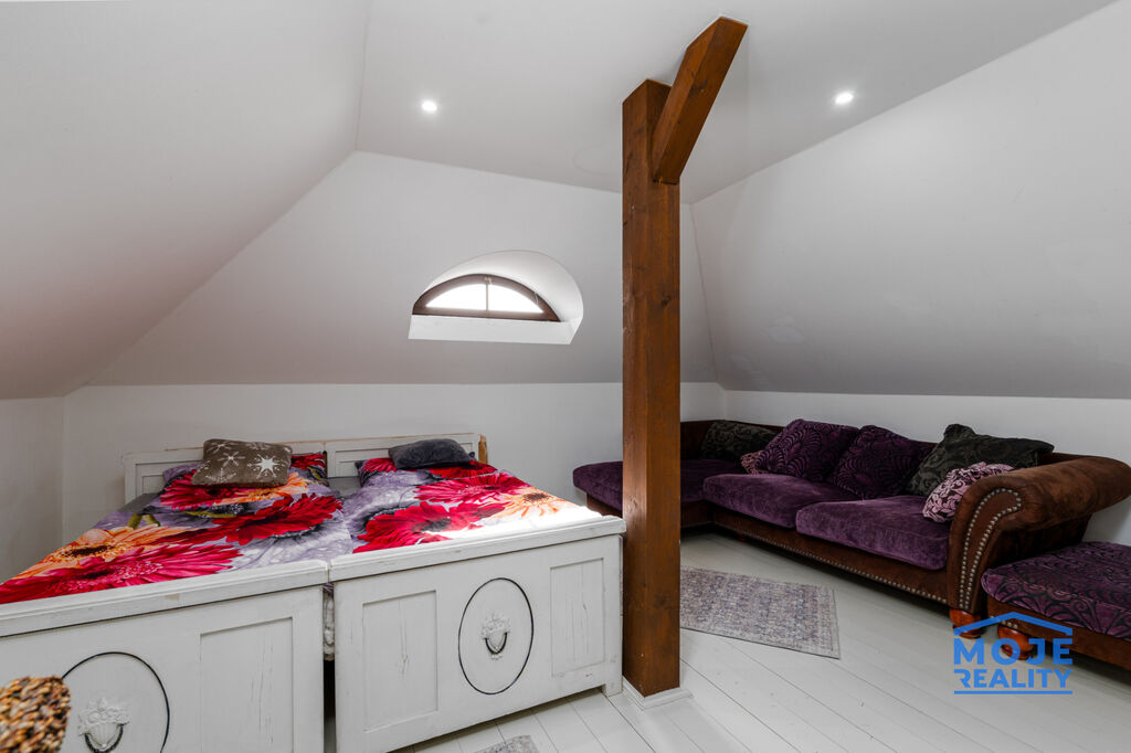 renovované dřevěné podlahy, nová okna (trojskla), kompletní renovace dřevěných trámů, koupelen i zázemí