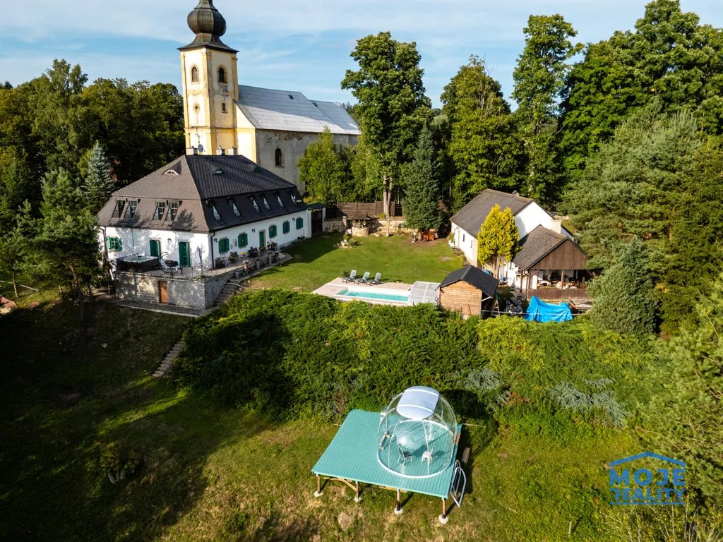 Prodej historické fary – exkluzivní venkovská vila s wellness, bazénem, kavárnou a rozlehlými loukami v srdci Českého lesa