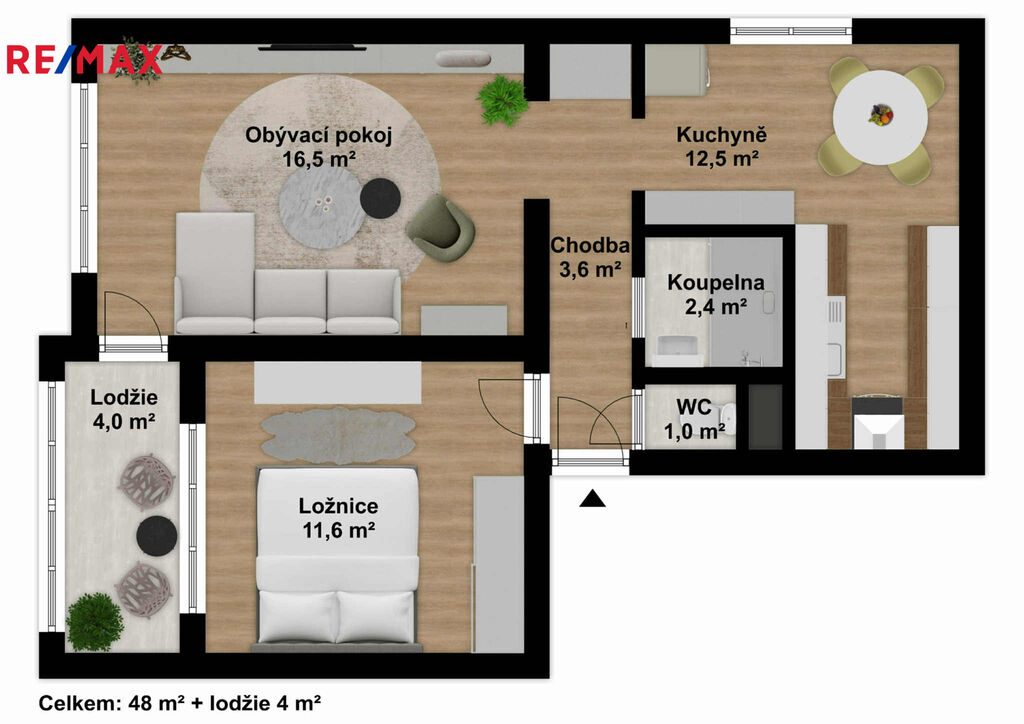 Byt o obytné ploše 48 m2 se nachází v 1.patře/3 , skládá se z prostorného obývacího pokoje (16,5 m2), ložnice (11,6 m2), kuchyně (12,5 m2), předsíně (3,6 m2), koupelny (2.4 m2) a samostatného WC (1 m2). K bytu náleží zasklená lodžie o velikosti (4 m2), a dva sklepy (10m2) dále možnost užívání společných prostor (kočárkárna).