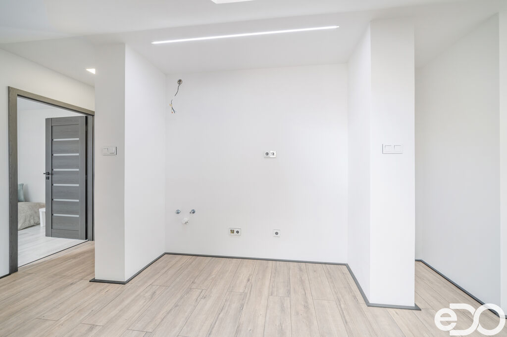 Na bytě najdeme tři samostatné pokoje, které je možné využít jako ložnice, dětské pokoje či pracovnu. Obývací pokoj je spojený s kuchyní, kterou si budoucí majitel bude moci dodělat podle sebe. Dále je zde technická místnost s elektrickým kotlem, která nabízí úložný prostor. Nachází se zde také úložný půdní prostor, který je možné využívat místo sklepa.
