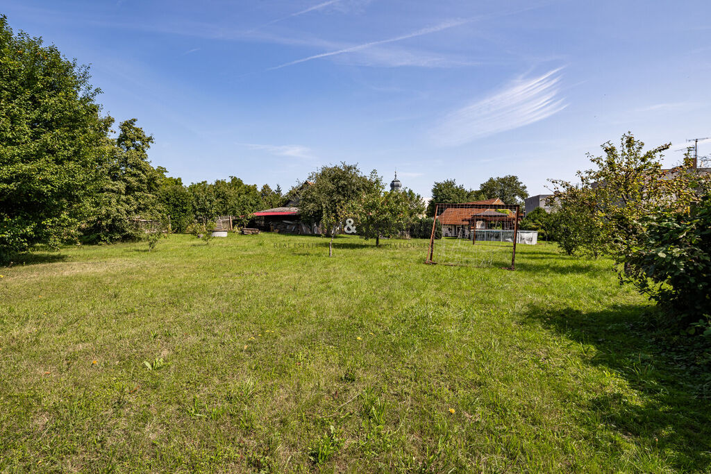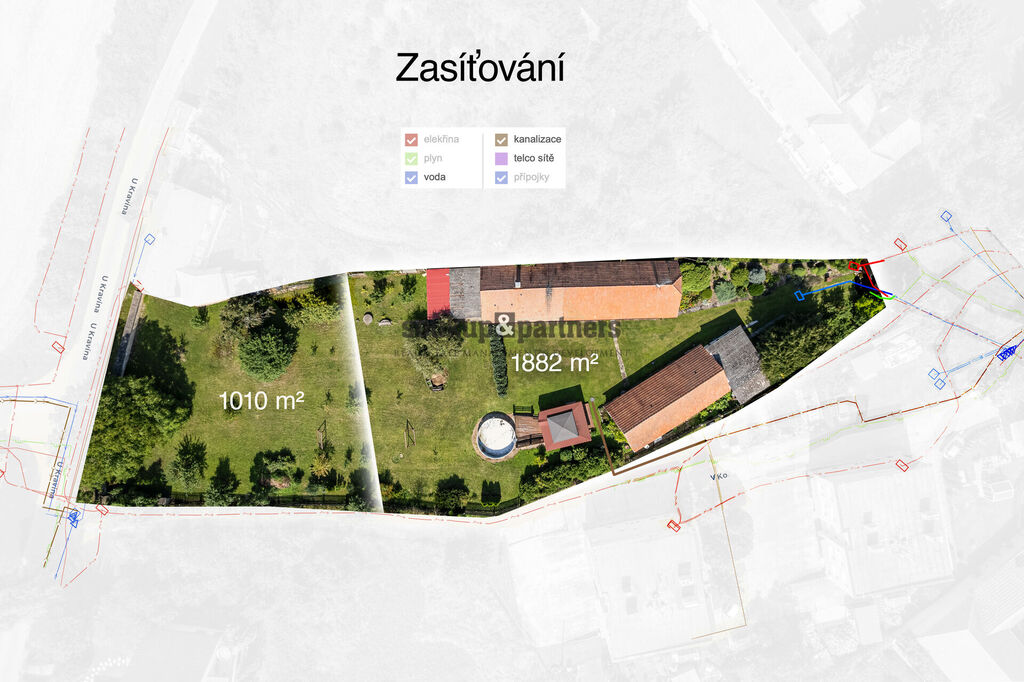 • 1 010 m² – zahrada vedená jako stavební parcela, s vlastní přístupovou cestou a kompletními inženýrskými sítěmi na hranici pozemku.