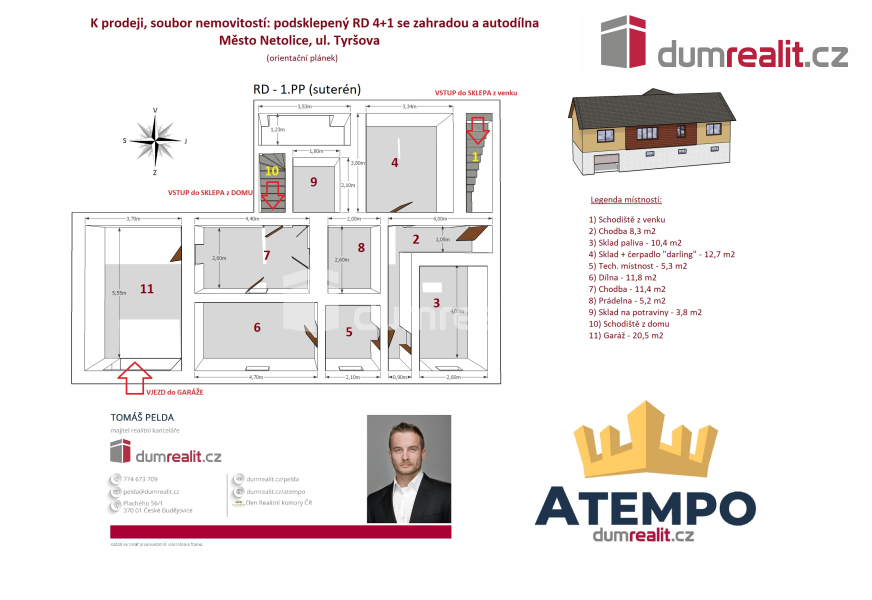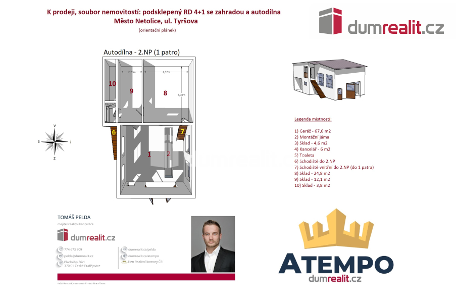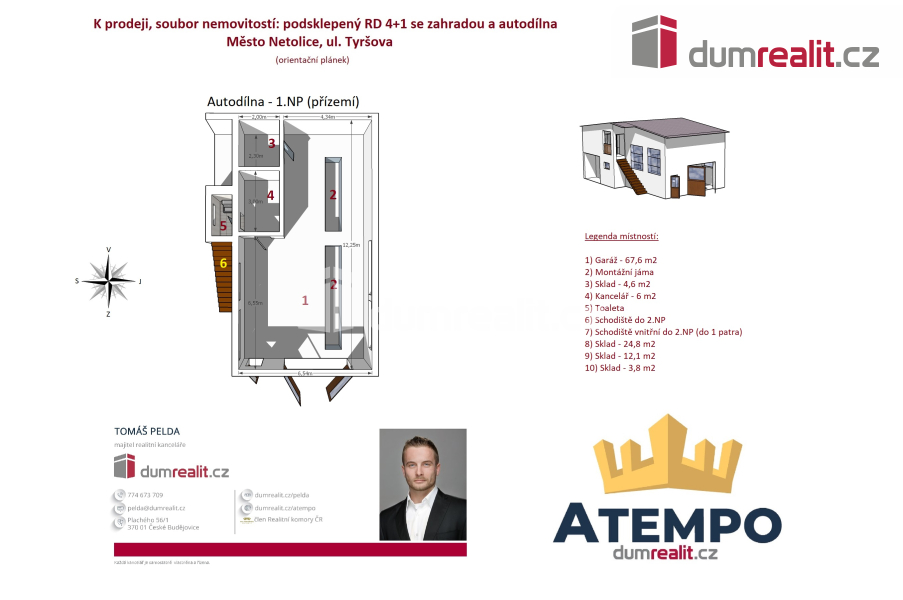 Dumrealit.cz Vám zprostředkuje koupi souboru nemovitostí na jednom místě v klidné lokalitě a to ve městě Netolice v ul. Tyršova: 1) poctivě postavený podsklepený zděný rodinný dům 4+1 s pergolou, bazénem, skleníkem a udržovanou zahradou; 2) AUTODÍLNA se zdviží, montážní jámou, sociálním zázemím, sklady a zpevněnými plochy na parkování. 1) RD je zděný a je připraven k okamžitému nastěhování. Dispozici jednotlivých podlaží a objektů naleznete na orientačním plánku mezi fotografiemi. Dům je variabilní, stejně tak i AUTODÍLNA, kterou lze zrekonstruovat na obytné prostory. RD má železobetonový strop mezi suterénem a 1.NP. Strop mezi 1.NP a půdou je zateplený dřevěný. Krov ve výborném stavu je pobitý prkny s eternitovými šablonami bez jakéhokoliv nedostatku a zatékání. Okna jsou dřevěná s dvojskly. Vchodové dveře jsou původní dřevěné. Garážová vrata v RD jsou automatická. Vytápění RD je kombinované s otopnou soustavou se "samotížkou": A) plynový kotel; B) kotel na tuhá paliva; C) kachlová kamna s výměníkem; D) vamberecká elektrická kachlová kamna. RD je napojen na plyn, elektřinu, městskou kanalizaci a veřejný vodovod + vlastní studna a darling. 2) AUTODÍLNA: zděný objekt s dřevěnými manuálními vraty, původní dřevěné vchodové dveře. Vybavení autodílny na fotografiích je součástí prodeje. Více informací o nabízených nemovitostech Vám poskytne realitní makléř Tomáš Pelda z realitní kanceláře A TEMPO fungující pod ochrannou známkou dumrealit.cz. Zajistíme Vám financování a veškerý právní servis. Ev. číslo: 652259.