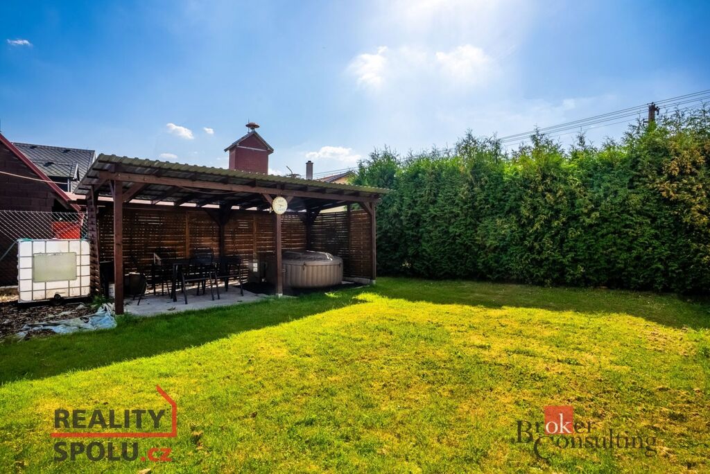 Za domem vás okouzlí klidná zahrada s protékajícím potokem, který vytváří jedinečnou atmosféru. Najdete tu i přístřešek pro venkovní posezení a místo pro vířivku – ideální k relaxu po práci.
