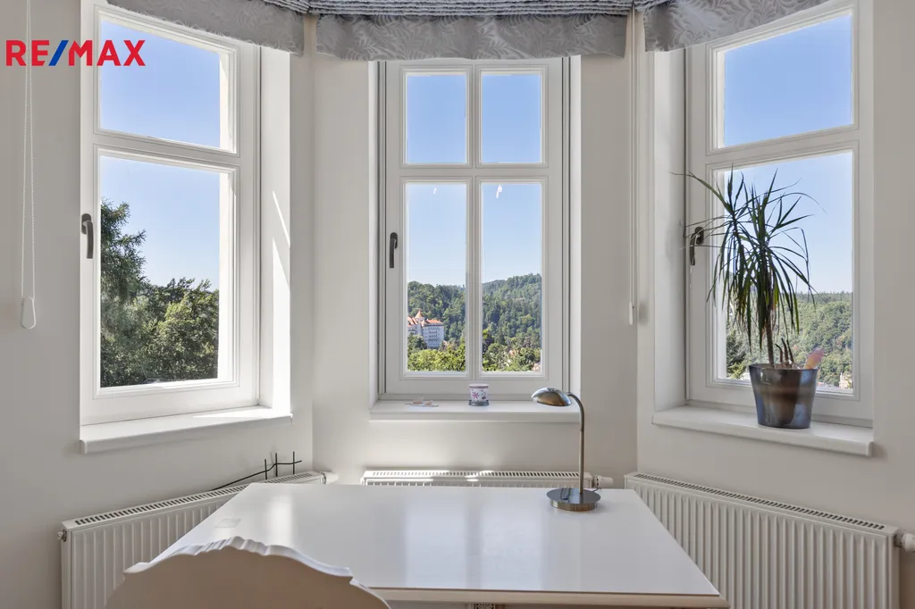V patře najdete pracovnu, ložnici s vlastní šatnou a koupelnou, vybavenou vanou i parním sprchovým boxem. Další pokoj nabízí vstup na balkon, odkud se otevírá dechberoucí výhled na Krušné hory, lázeňské lesy a rozhlednu Diana – jako byste se dívali do pohádky.