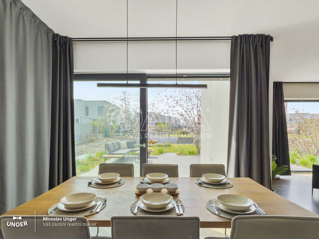 • Prostorný obývací pokoj se dvěma velkými prosklenými plochami a výhledem do zahrady