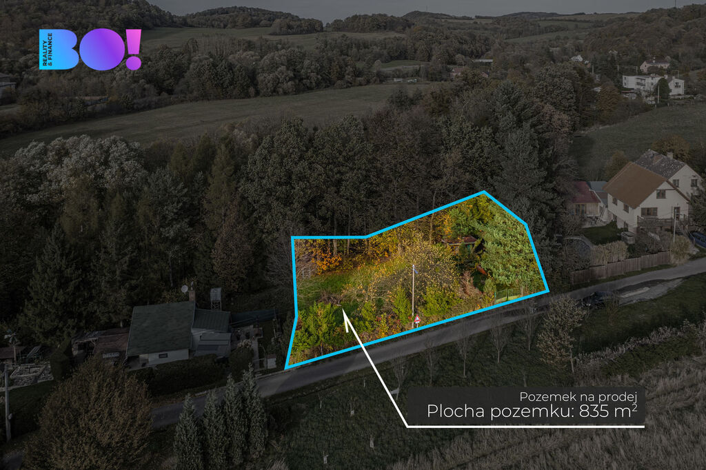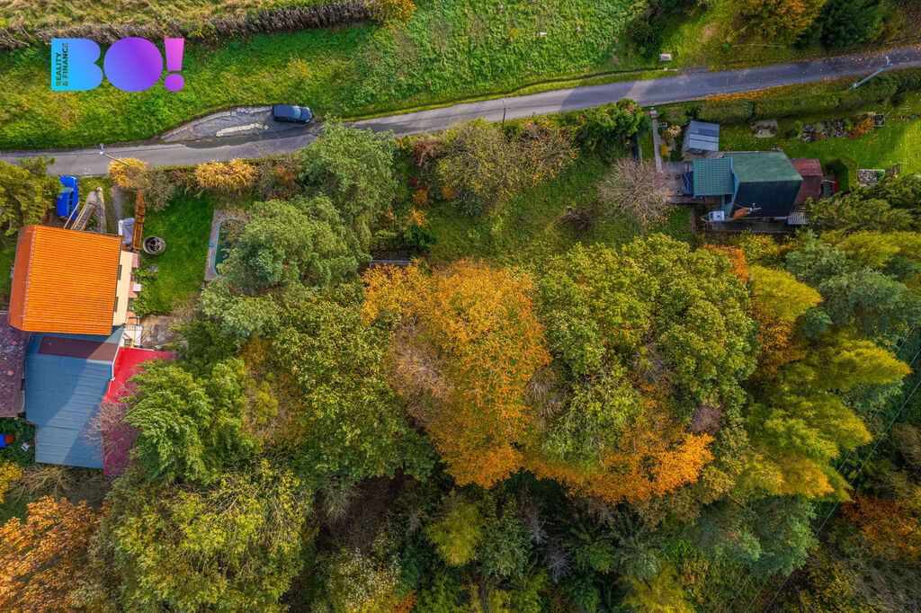 Místo zatím sloužilo jako zahrada. Stromy, vzrostlé okrasné keře, starší kůlna i oplocení potřebují údržbu, ale úpravou nebo jednoduchým odstraněním získáte zajímavý prostor. Pozemek je z jedné strany propojený s lesem a volným prostorem, z druhé strany s výhledem na pole a louky lemované pahorky.