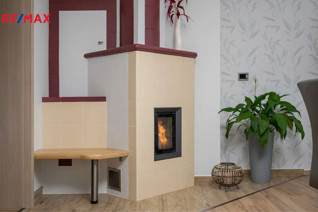 - Vytápění domu je podlahové a je zajištěno plynovým kondenzačním kotlem. Obývací pokoj a chodbu lze vytápět kachlovými kamny.