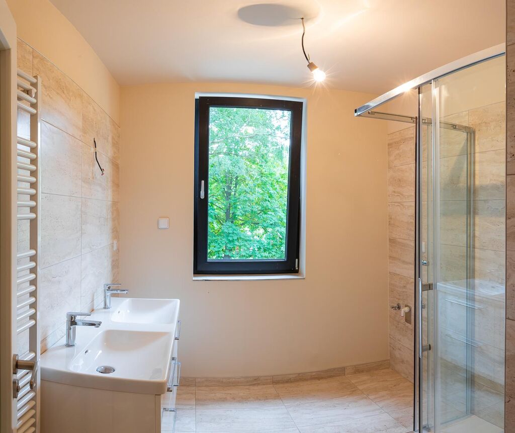 V bytě jsou dřevěné podlahy, koupelna v moderním designu s umyvadlem a sprchovým koutem, výhodou je samostatná toaleta s umyvadlem.