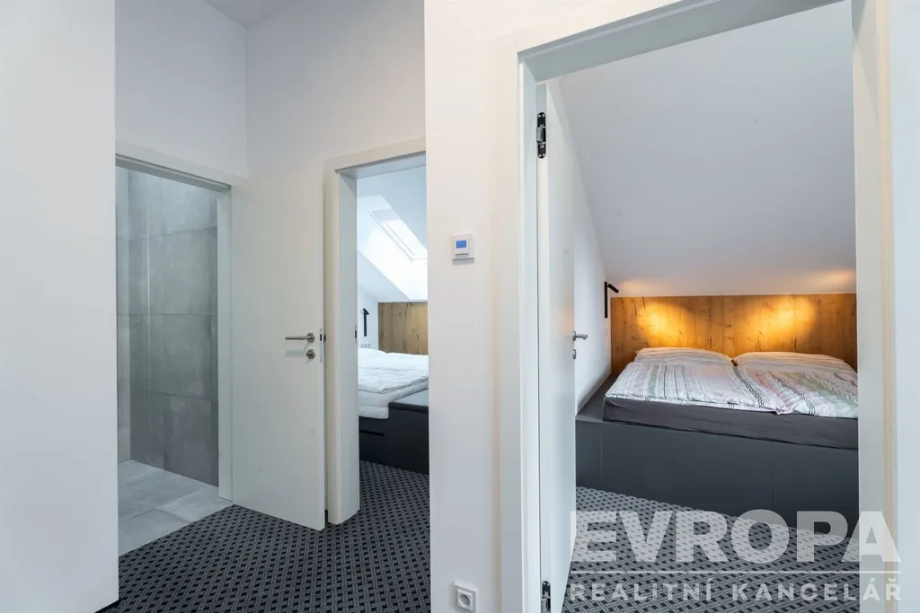 Podkroví – dvě ložnice, další prostor ideální jako šatna nebo místo pro přistýlku, a druhá koupelna
