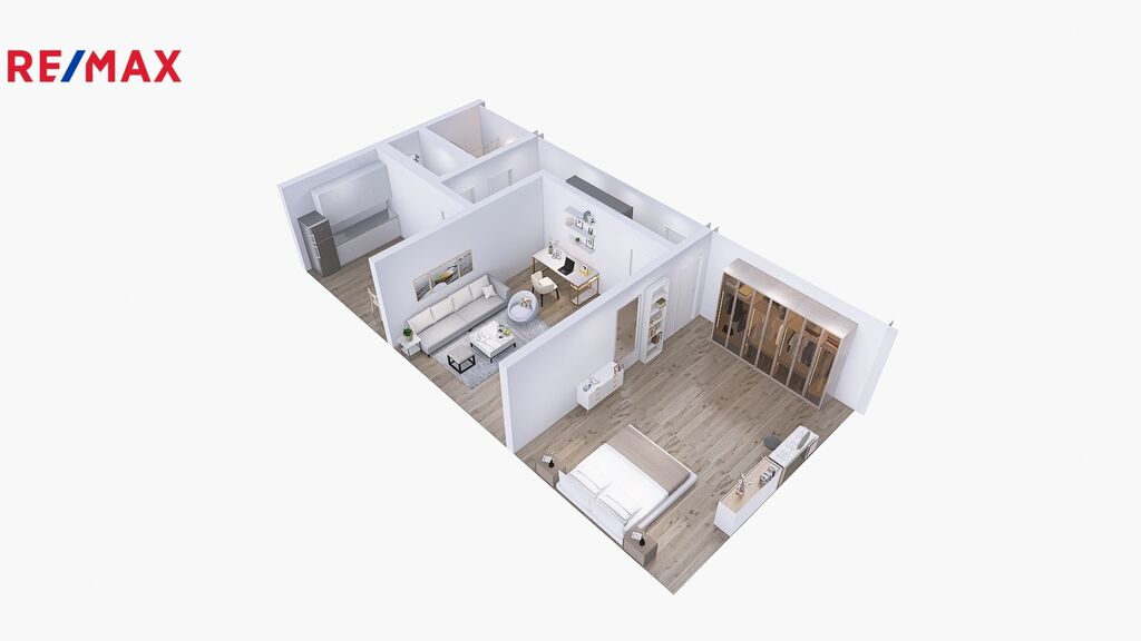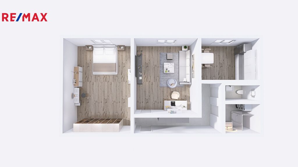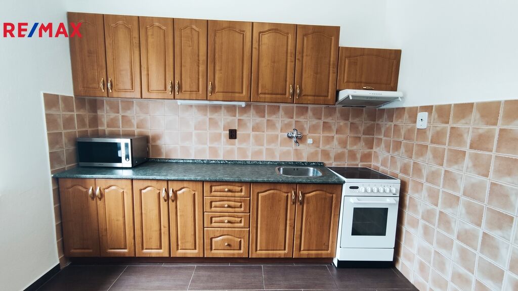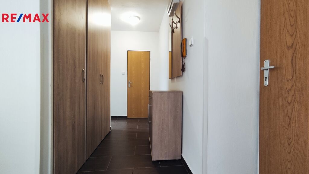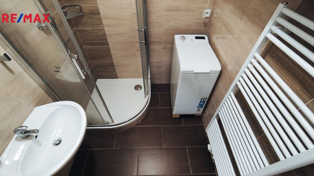 V bytě najdete kuchyňskou linku vybavenou elektrickou troubou, koupelnu se sprchovým koutem, umyvadlo s vlastní skříňkou a prostorem pro myčku i sušičku. Samostatné WC, a dva oddělené pokoje.