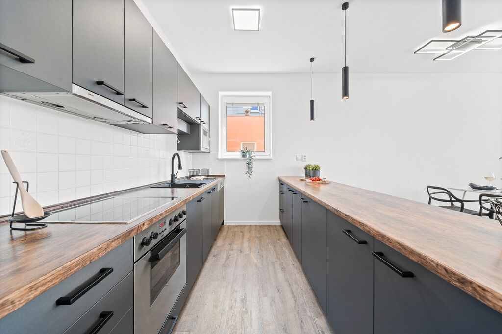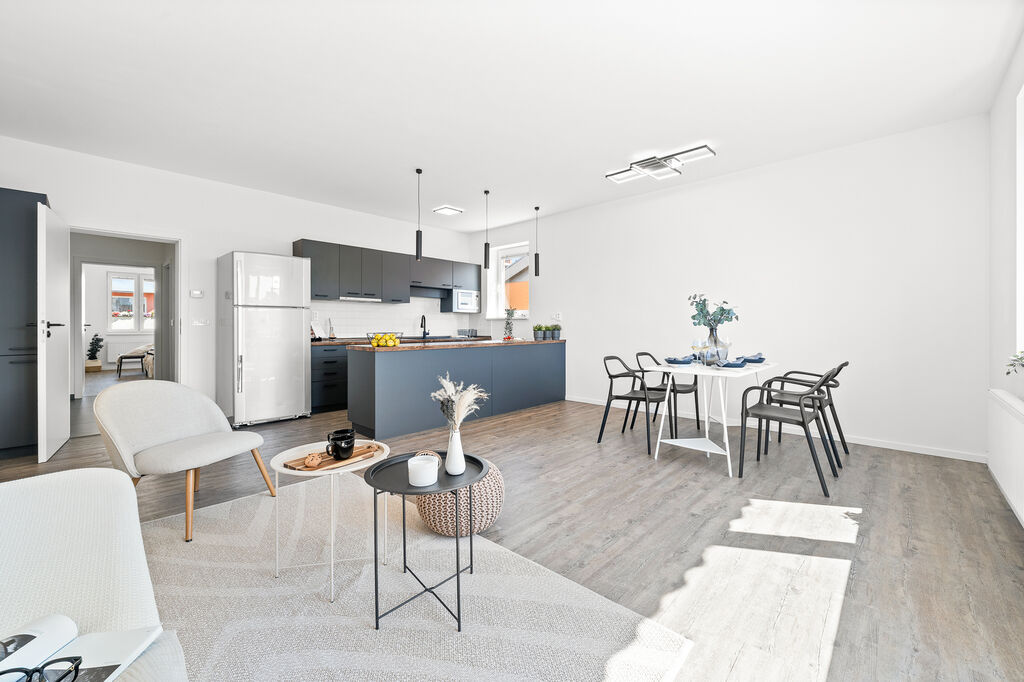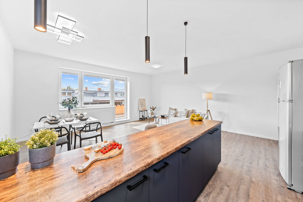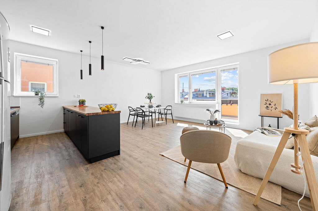 Dominantou celého bytu je obývací pokoj o výměře 34 m², vybavený kuchyňskou linkou se všemi spotřebiči. A jako třešnička na dortu je zde přímý vstup na hlavní terasu o velikosti 8 m² s jihozápadní orientací, kde si každý večer můžete vychutnat krásný západ slunce.