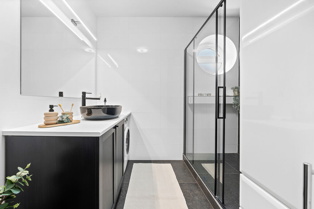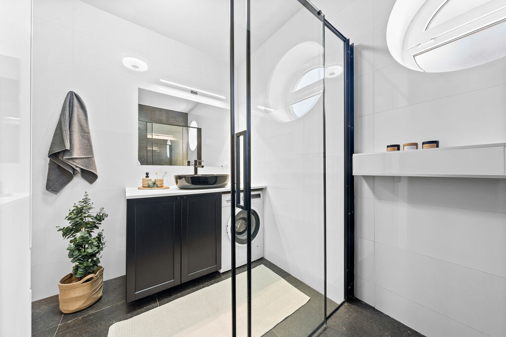 Další část bytu tvoří koupelna s prostorným sprchovým koutem a samostatná toaleta s vlastním umyvadlem. Pokud vás doposud trápil nedostatek úložného prostoru, tady se rozhodně bát nemusíte, protože byt disponuje nejen komorou přímo v bytě, ale i vlastním sklepem.