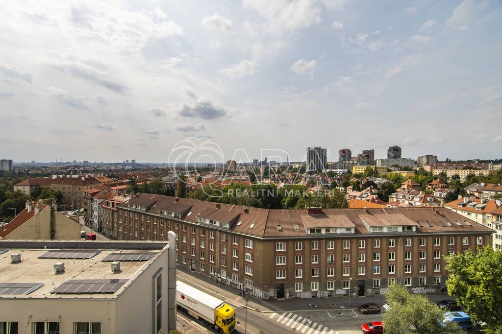 Bytová jednotka se skládá z jednoho obytného pokoje, který působí překvapivě vzdušně. Dominují mu čtyři velká dvoukřídlá okna, která zajišťují nejen spoustu denního světla, ale i otevřený výhled směrem na Prahu. Díky západní orientaci si zde můžete užívat dechberoucí západy slunce. Kuchyňský kout je na byt této velikosti prostorný a nabízí možnost úpravy...buď zachovat barový pult, nebo vytvořit moderní linku s dostatkem místa pro stolování. Koupelna s vanou a toaletou je v původním stavu, ale díky své velikosti a dispozici poskytuje dobrý základ pro rekonstrukci.