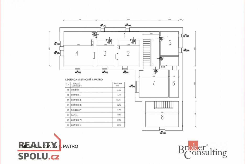 1. patro: čtyři pokoje, prostorná koupelna s toaletou a šatna