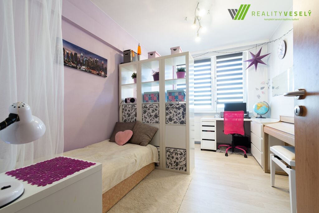 Dispozice zahrnuje vstupní chodbu s vestavěnými skříněmi, které poskytují dostatek úložného prostoru, dále kuchyň, obývací pokoj, ložnici, dětský pokoj, koupelnu s vanou a samostatnou toaletu.