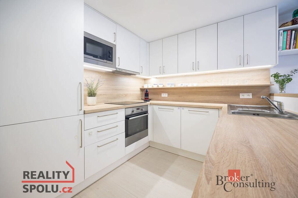 Nový majitel získá nejenom byt, ale i podstatnou část jeho vybavení: praktické vestavěné skříně, krásnou kuchyňskou linku a schody z masivu s příjemným LED osvětlením.