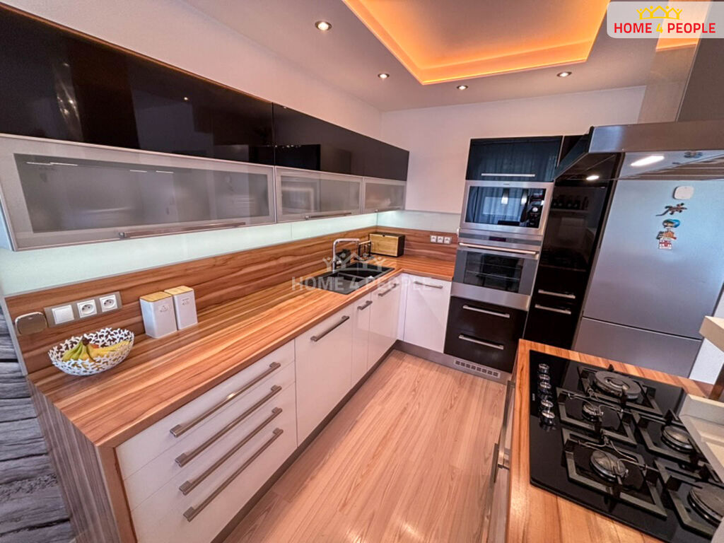 moderní kuchyňskou linkou s ostrůvkem, plynovou sklokeramickou deskou a všemi